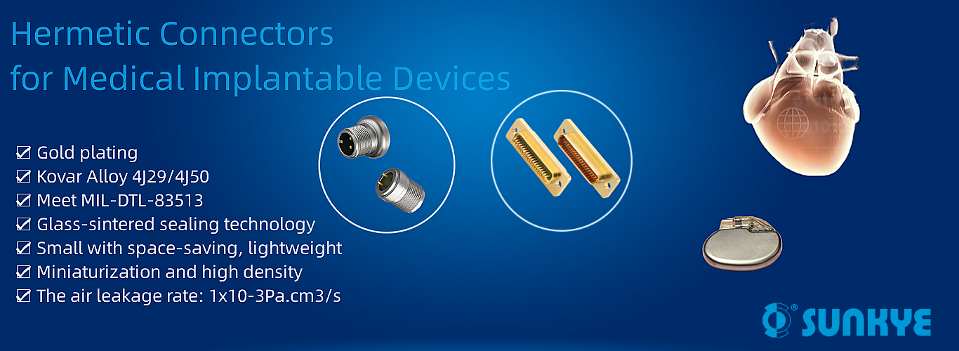 When medical equipment is sterilized under heat, pressure, chemicals, and water processes. hermetic products protect against various environmental conditions, including changes in atmospheric pressure, humidity/moisture, soil/grime, and other factors thatwould damage electrical connections,ensuring the integrity of delicate electronics. Sealed connectors serve implantable devices in medical systems. In implantable electronics such as audiology and cardiac devices, hermetic connectors protect the electronic device and ensure its functionality within the human body. Sunkye glass-sintered sealing connectors are ideal for medical implants applications where thermal stability, mechanical strength, insulation resistance,weight and size are a critical concern. Sunkye typically specifies Kovar alloy for its hermetic products to provide an effective barrier against gas ingress and corrosion.